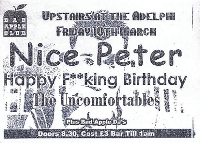 Flyer promoting a performance by Nice Peter, Happy F**king Birthday, and The Uncomfortables upstairs at The Adelphi, Preston, on Friday 10th March 2006. An event by Bad Apple Club.