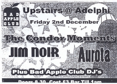 Flyer promoting a performance by The Condor Moments, Jim Noir, and Aurota, upstairs at The Adelphi on Friday 2nd December 2005. An event by Bad Apple Club.