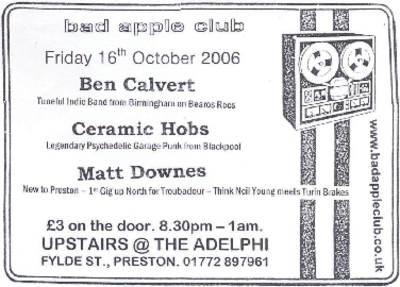 Flyer promoting a performance by Ben Calvert, Cermaic Hobs, and Matt Downes at The Adelphi on Friday 16th October 2006. An event by Bad Apple Club.