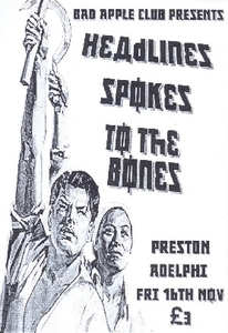 Flyer promoting a performance by Headlines, Spokes, and To The Bones at The Adelphi on Friday 16th November 2007. An event by Bad Apple Club.
