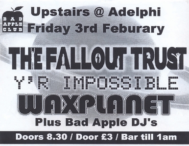 Flyer promoting a performance by The Fallout Trust, Y'r Impossible, and Waxplanet, at The Adelphi on Friday 3rd February 2006. An event by Bad Apple Club.