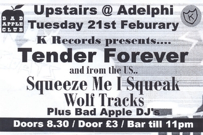 Flyer promoting a performance by Tender Forever, Squeeze Me I Squeak, and Wolf Tracks at The Adelphi on Tuesday 21st February 2006. An event by Bad Apple Club.