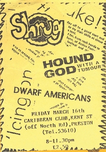 Flyer promoting a performance by Shrug, Hound God With A Tumour, and Dwarf Americans at the Caribbean Club, Preston on Friday 16th March c1990.