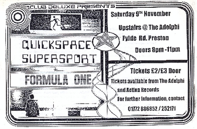 Flyers promoting a performance by Quickspace Supersport and Formula One at The Adelphi, Preston on Saturday 9th November c1996. An event by Club Deluxe.