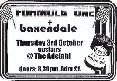 Flyer promoting a performance by Formula One and Baxendale at The Adelphi, Preston on Thursday 3rd October c1996.