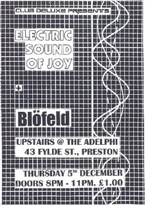 Flyer promoting a performance by Electric Sound of Joy and Blofeld at The Adelphi, Preston, on Thursday 5th December c2000s (exact date unknown). An event by Club Deluxe.