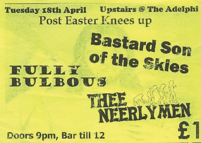 Flyer promoting a 'Post Easter Knees Up' with performances from Bastard Son of the Skies, Fully Bulbous, and Thee Neerlymen at The Adelphi, Preston, on Tuesday 18th April c2000s (exact year unknown).