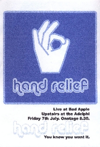 Flyer promoting a performance by Hand Relief at The Adelphi, Preston, on Friday 7th July c2006. An event by Bad Apple Club.