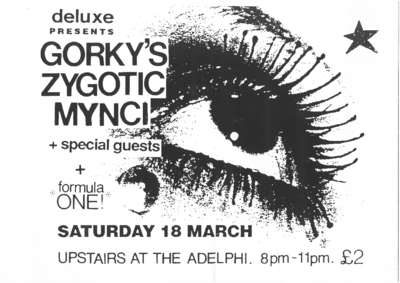 A poster promoting a performance by Gorky's Zygotic Mynci and Formula One at The Adelphi, Preston, on Saturday 18th March 1995. An event by Club Deluxe.