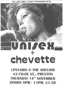 Poster promoting a performance by Unisex and Chevette at The Adelphi, Preston, Thursday 14th November. Exact year unknown but it is in the range of late '90s to early 00's. An event by Club Deluxe.