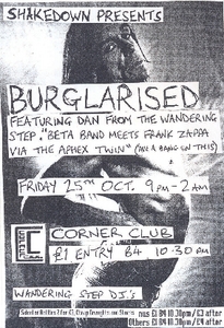 Flyer promoting a performance by Burglarised at The Corner Club, Preston, on Friday 25th October c1990s (exact year is unknown).