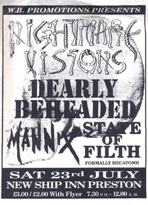 Poster promoting a performance by Nightmare Visions, Dearly Beheaded, Mannix, and State of Filth at the New Ship Inn, Preston, on Saturday 23rd July c1994.
