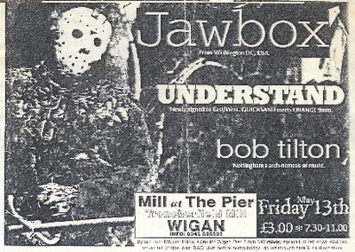 Flyer promoting a performance by Jawbox, Understand, and Bob Tilton at The Mill at the Pier, Wigan, on Friday 13th May c1994.