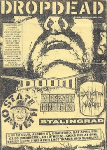 Flyer promoting a performance by Dropdead, Doom, State of Filth, Voorhees, Extinction of Mankind, and Stalingrad at the 1 in 12 Club, Bradford, on Saturday 8th April 1995.