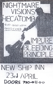 Flyer promoting a performance by Nightmare Visions, Hecatomb, Impure and Bleeding Principle at New Ship Inn, Preston, on the 23rd April c1990s (exact year unknown).
