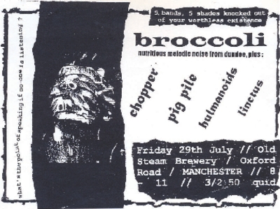 Flyer promoting a performance by Broccoli, Chopper, Pig Pile, Hulmanoids, and Linctus at Old Steam Brewery, Manchester, on Friday 29th July c1990s (exact year unknown).