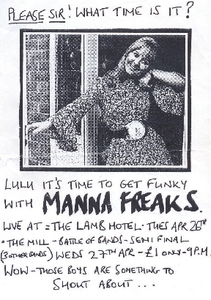 Flyer promoting two performances by Manna Freaks in Preston c1994.