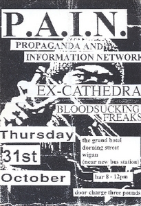 Flyer promoting a performance by P.A.I.N (Propaganda And Information Network), Ex-Cathedra, and Bloodsucking Freaks at The Grand Hotel, Wigan, on Thursday 31st October c1990s (exact year unknown).