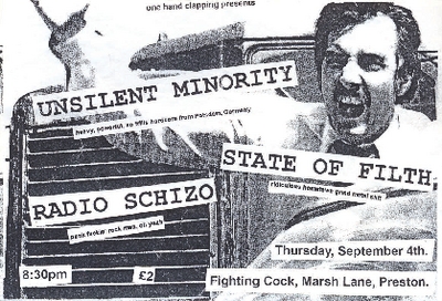 Flyer promoting a performance by Unsilent Minority, State of Filth, and Radio Schizo at the Fighting Cock, Preston, on Thursday 4th September c1990s (exact year unknown).