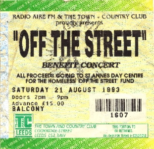 Ticket for the 'Off The Street' Benefit Concert at The Town and Country Club, Leeds, on Saturday 21st August 1993.