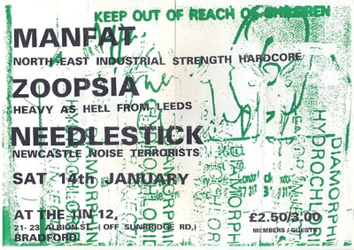 Poster promoting a performance by Manfat, Zoopsia, and Needlestick at the 1 In 12 Club, Bradford, on Saturday 14th January c1995.