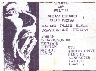 Flyer promoting the release of a demo record (name unknown) by State of Filth in c1990s (exact year unknown).