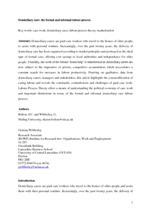 Domiciliary carers are paid care workers who travel to the homes of older people to assist with personal routines. Increasingly, over the past 20 years, the delivery of domiciliary care has been organised according to market principles and portrayed as the ideal type of formal care; offering cost savings to local authorities and independence for older people. Crucially, the work of the former ‘home help’ is transformed as domiciliary carers are now subject to the imperative of private, competitive accumulation which necessitates a constant search for increases in labour productivity. Drawing on qualitative data from domiciliary carers, managers and stakeholders, this article highlights the commodification of caring labour and reveals the constraints, contradictions and challenges of paid care work. Labour Process Theory offers a means of understanding the political economy of care work and important distinctions in terms of the formal and informal domiciliary care labour process.