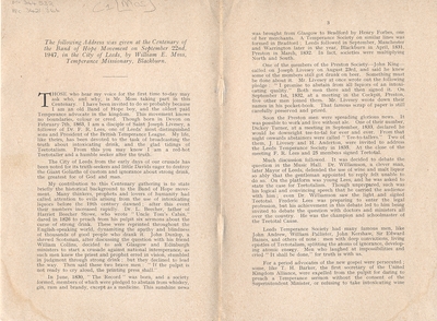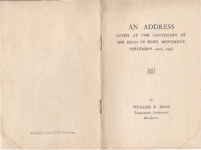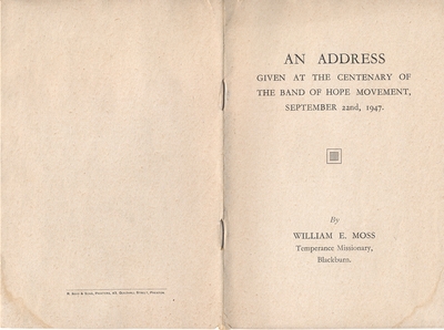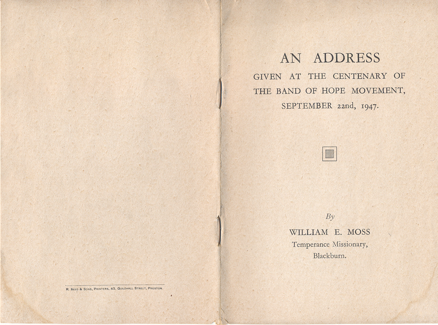 Moss, William E. (1947) AN ADDRESS GIVEN AT THE CENTENARY OF THE BAND OF HOPE MOVEMENT, SEPTEMBER 22nd, I947. R.Seed and sons printers, Preston.