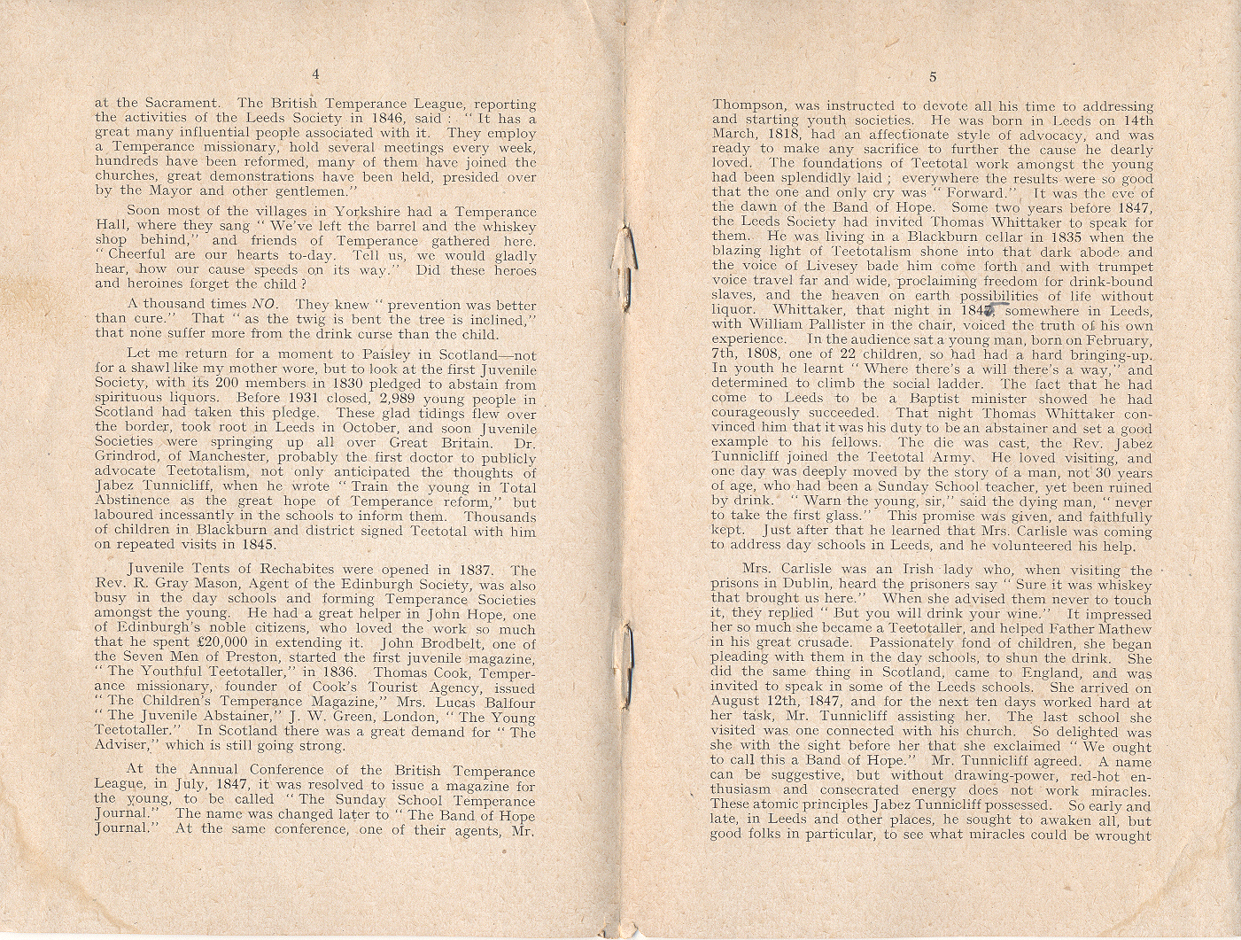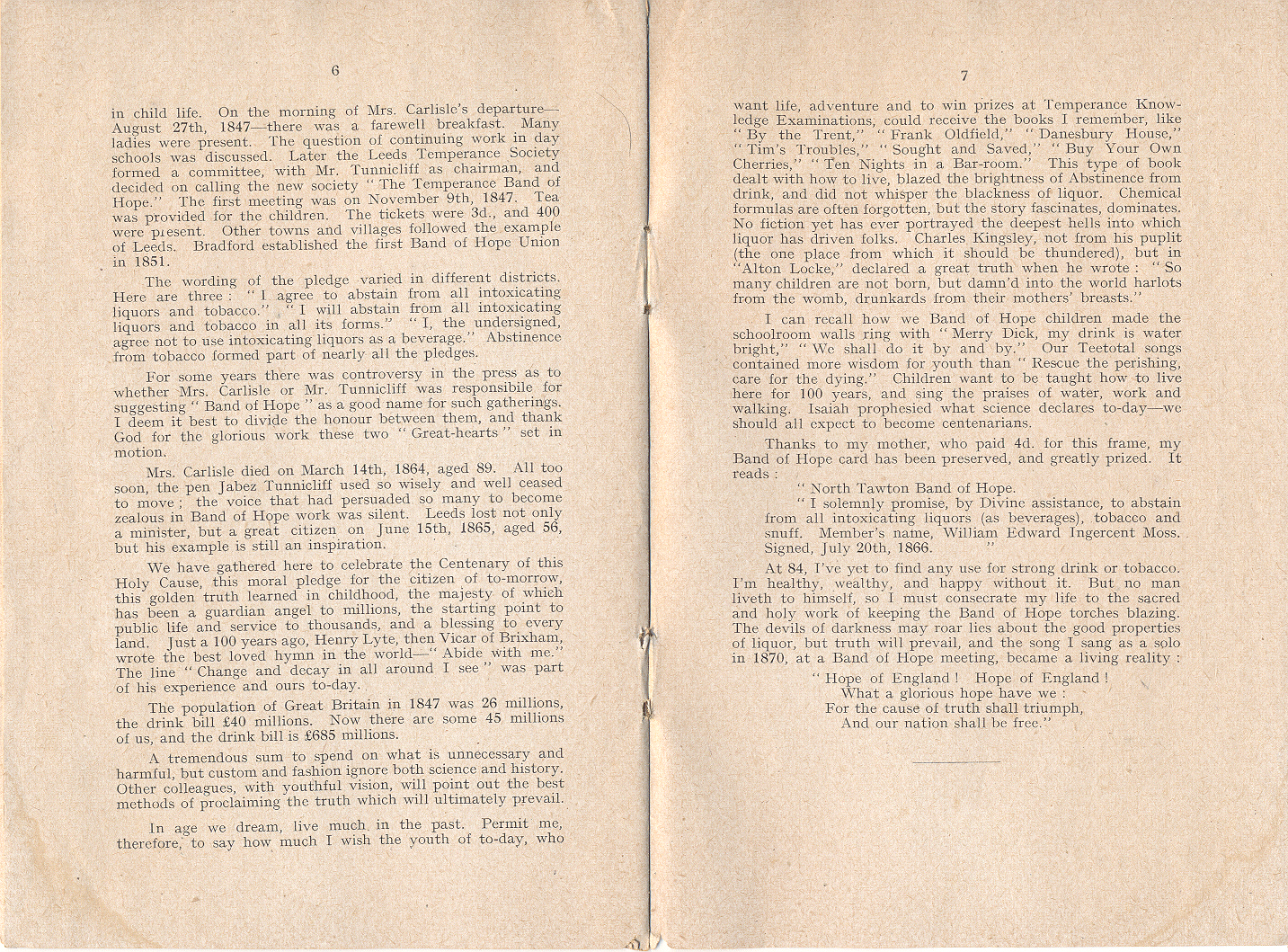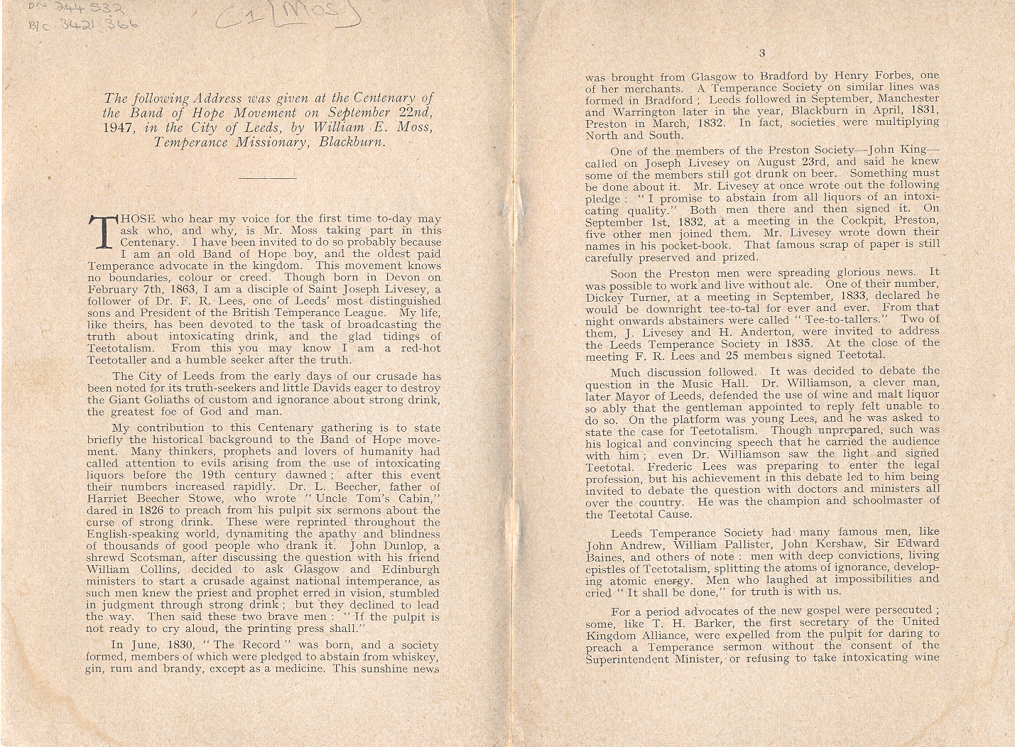 Publication of William E.Moss giving an address in Leeds to celebrate a centenary of the band of hope movement. Mentions Joseph Livesey,teetolalism and the curse of strong drink.