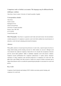 Stone, Clare orcid iconORCID: 0000-0001-7331-4244 (2015) Competence Units or Holistic Assessment. The Language may be Different but the Challenges Continue. Journal of Practice Teaching and Learning, 13 (1). pp. 44-56.