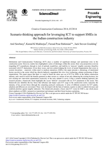 Information and Communication Technology (ICT) plays a number of significant strategic and operational roles in the construction sector. However, studies have highlighted a series of challenges within this sector, from value-proposition aversion (regarding ICT expenditure), through to lack of aptitude (capability), and inability to ‘measure’ tangible outcomes (benefits) associated with ICT deployment. Given these issues, and also acknowledging the levels of nested fragmentation that exists in sectoral disciplines – especially within small to medium enterprises (SMEs); this paper presents a chronology of interrelated factors peculiar to the sector which has directly/indirectly engendered this slow (low) technology adopter positioning of these organisations. This paper argues that there is a need to break the status quo use of ICT by SMEs in the Indian construction industry, and a need to realise the benefits garnered in other sectors as a means of not only enhancing the existing business, but also creating new innovation opportunities (especially in the early adopter S curve). Using a scenario thinking approach, this research presents a framework which highlights the causal “deficits” associated with low ICT penetration in the sector. This framework also identifies the key forces that influence and impact upon ICT usage in the construction sector, especially the interplay of key pivotal forces (through the competing push-pull continuum). A series of different scenarios for ICT uptake, adoption and diffusion are envisioned. These were developed with the help of industry experts in order to embed relevance and establish priorities against tangible indicators. This framework presents a future state ICT vision for SME's, one which places direct emphasis on SMEs’ perspectives (operational and strategic) and their future business aspirations.