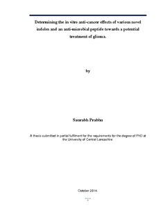 Prabhu, Saurabh (2014) Determining the in vitro anti-cancer effects of various novel indoles and an anti-microbial peptide towards a potential treatment of glioma. Doctoral thesis, University of Central Lancashire.
