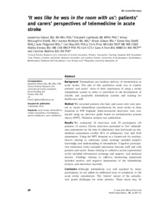 Method: We recruited patients who had, and carers who were present at, recent telemedicine consultations for acute stroke in three hospitals in NW England. Semistructured interviews were conducted using an interview guide based on normalisation process theory (NPT). Thematic analysis was undertaken.