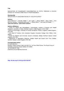 McCourt, Fiona, O'Neill, Brenda, Logan, Ian, Abbott, Janice orcid iconORCID: 0000-0001-9851-1236, Plant, Barry, McCrum-Gardner, Evie, McKeown, Stephanie, Stuart Elborn, J and Bradley, Judy M (2015) Indicators of pulmonary exacerbation in cystic fibrosis: A Delphi survey of patients and health professionals. Journal of Cystic Fibrosis, 14 (1). pp. 90-96. ISSN 15691993