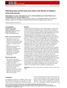 was seen to confer a value on them as well as on service users. However, not all the SWPs were able to achieve these aspects of place, and engaging children and families in place was less likely when the service user population was widely dispersed. Recognising the importance of place and how place is constructed through relationships between people as well as through the physical environment appeared to be key to creating offices that combated the stigma attached to out-of-home care.