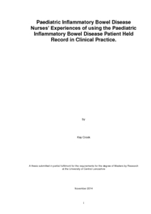 Crook, Kay Pauline (2014) Paediatric Inflammatory Bowel Disease Nurses’ Experiences of using the Paediatric Inflammatory Bowel Disease Patient Held Record in Clinical Practice. Masters thesis, University of Central Lancashire.