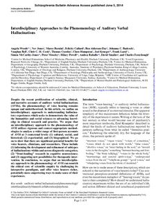 Woods, Angela, Jones, Nev, Bernini, Marco, Callard, Felicity, Alderson-Day, Ben, Badcock, Johanna, Bell, Vaughn, Cook, Chris, Csordas, Thomas et al (2014) Interdisciplinary approaches to the phenomenology of auditory verbal hallucinations. Schizophrenia Bulletin, 40 . S246-S254.