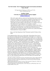 The article explores efforts to reform the State Department under presidents Kennedy and Johnson, with the intention of making the Department better able to lead and coordinate the sprawling foreign policy apparatus. However, Kennedy soon gave up on what he described as the 'bowl of jelly', so the reform effort was left to Johnson. Under him there were attempts to boost the State Department's internal efficiency and its ability to support counterinsurgency efforts. Yet there was a justified perception by the end of 1968 that the State Department was unredeemed managerially and in terms of its standing in the foreign policy nexus. Reasons for the lack of progress include sporadic presidential engagement, and Secretary of State Dean Rusk's limited aptitude for managerial affairs.