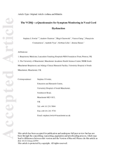 Fowler, Stephen J., Thurston, Andrew, Chesworth, Brigit orcid iconORCID: 0000-0001-7936-5536, Cheng, Vinton, Constantinou, Panayiotis, Vyas, Aashish, Lillie, Siobhan and Haines, Jemma (2015) The VCDQ - a Questionnaire for Symptom Monitoring in Vocal Cord Dysfunction. Clinical & Experimental Allergy . n/a-n/a. ISSN 09547894