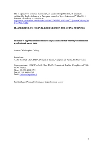This study examined the influence of opposition team formation on physical and skill-related performance in a professional soccer team. Performance in forty-five French League 1 matches played over three competitive seasons (2007-08, 2008-09, and 2009-10) was analysed using multi-camera computerised tracking. Players (n=21) in the reference team (using a 4-3-3/4-5-1 formation) were analysed in matches against three opposition team formations: 4-4-2 (11 games), 4-3-3/4-5-1 (16 games) and 4-2-3-1 (18 games). Performance was compared for defending and midfield units as a whole and individually across four positions: fullbacks, central-defenders and central- and wide-midfielders. Collectively, players covered a greater total distance (p<0.05) and distance in low/moderate-intensity running (0-14.3km/h) (p<0.05) in matches against a 4-2-3-1 compared to a 4-4-2 formation. Distance covered in high-intensity (14.4-19.7km/h) and very high-intensity running (≥19.8km/h) was not affected by opposition formation. In contrast, players covered more distance in total high-intensity performance (≥14.4km/h) when the reference team was in possession against a 4-4-2 compared to a 4-2-3-1 formation (p<0.05) while more distance was run at these speeds when the reference team was out of possession against a 4-2-3-1 (p<0.01) and a 4-3-3 (p<0.05) compared to a 4-4-2 formation. Players ran less distance at low/moderate intensities in the second- versus first-half of matches against all three formations (p<0.01 to p<0.05) whereas total distance and high-intensity performance was unaffected. None of the measures of physical performance across the individual playing positions were affected by opposition team formation. Skill-related performance varied according to opposition formation: players as a whole performed more passes versus a 4-4-2 than a 4-2-3-1 (p<0.01), ground and aerial duels versus a 4-2-3-1 compared to a 4-4-2 (both p<0.01); 1-touch passes versus a 4-2-3-1 compared to a 4-4-2 (p<0.01) and a 4-3-3/4-5-1 (p<0.05). The mean number of touches per possession was highest versus a 4-4-2 compared to a 4-3-3/4-5-1 (p<0.01) and a 4-2-3-1 (p<0.01). While skill-related performance across the four individual playing positions was generally unaffected by opposition team formation, mean pass length was greater in central-midfielders against a 4-4-2 compared to 4-3-3/4-5-1 (p<0.05) and 4-2-3-1 (p<0.01) formations. In general, these findings suggest that physical performance in the reference team was not greatly affected by opposition team formation. In contrast, skill-related demands varied substantially according to opponent formation and may have consequences for tactical and technical preparation and team selection policies.