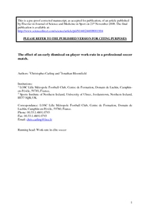 The aim of this study was to examine the effects of an early dismissal (after 5-minutes play) on work-rate in a professional soccer match. A computerised player tracking system was used to assess the work-rates of seven players who completed the match on the team with 10 players. A minute-by-minute analysis of the remaining 91mins following the dismissal was performed for the total distance covered, the distance covered in five categories of movement intensity and the recovery time between high-intensity efforts for each player. The data were calculated for each half and for three equal intervals within each half and profiled against normative data for the same players obtained from analyses of 15 games in the same season. Following the dismissal, the players covered a greater total distance than normal (p<0.025), particularly in moderate-intensity activities (p<0.01) and had shorter recovery times between high-intensity efforts (p<0.025). In contrast, there was a significant reduction between game halves for total distance covered at both the highest (p<0.025) and lowest running intensities (p<0.01). However, there were no differences in high-intensity activities across the three intervals in the second-half. These findings suggest that in 11 v 11, players may not always utilise their full physical potential as this match illustrated an increase in overall work-rate when reduced to 10 players. However, as a team with 10 players is likely to incur higher levels of fatigue, tactical alterations may be necessary and/or players may adopt a pacing strategy to endure the remainder of the match.