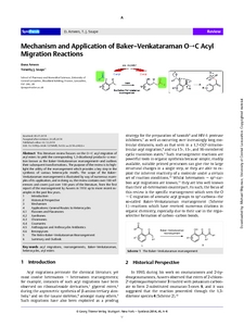 the utility of the rearrangement which provides a key step in the synthesis of various heterocyclic motifs. The scope of the Baker–Venkataraman rearrangement is illustrated by way of numerous examples of its application, and in doing so, the review contains over 100 references and covers just over 100 years of the literature, from the first report of the rearrangement by Auwers in 1910 up to more recent examples in the past few years.