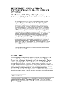 The renegotiation of road projects has been an important issue that has generated concerns in PPP procurement over the last decade. This has had serious policy implications for public procurement policy across countries because of its implications for the achievement of the objectives defined at the inception of PPP road contracts. This paper assesses the renegotiation of Public-Private Partnership (PPP) infrastructure projects in order to identify the issues involved in renegotiation and its outcomes. Data were collected through a literature review of selected studies on PPP infrastructure projects on a sectoral basis with particular emphasis on Latin America, Portugal and Spain. It was revealed that a high proportion of PPP contracts in the transport sector are renegotiated: Indeed, in the transport sector, more PPP road projects are renegotiated than other forms of transport projects. The main factors surrounding the renegotiation of road contracts are: lack of an adequate contract design, frequent opportunistic behaviour on the part of both public and private partners during the implementation of PPP road projects, changes in the conditions affecting revenue and costs beyond the reasonable assumptions accounted for in the original contract, corruption, and political and economic instability, all of which in most instances reduce the chance of the public partner achieving its objective of value for money (VfM). The paper concludes with a discussion of the need to develop a framework for integrating considerations of value for money into the renegotiation process of PPP road contracts.