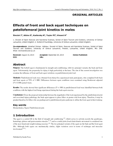 Purpose: The barbell squat is fundamental in strength and conditioning, with two principal variants; the back and front squat. Unfortunately, the propensity for injury is high particularly at the knee. The aim of the current investigation was examine the influence of front and back squat variations on patellofemoral joint load.