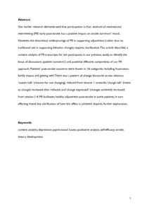 Our earlier research demonstrated that participation in four sessions of motivational interviewing (MI) early post-stroke has a positive impact on stroke survivors' mood. However, the theoretical underpinnings of MI in supporting adjustment (rather than its traditional use in supporting behavior change) require clarification. This article describes a content analysis of MI transcripts for 10 participants in our previous study, to identify the focus of discussions (patient "concerns") and potential effective components of our MI approach. Patients' post-stroke concerns were shown in 16 categories, including frustration, family impact, and getting well. There was a pattern of change discourse across sessions: "Sustain talk" (reasons for not changing) reduced from Session 1 onward, "change talk" (intent to change) increased then reduced, and "change expressed" (changes achieved) increased from Sessions 1 to 4. MI facilitates healthy adjustment post-stroke in some patients, in turn affecting mood, but clarification of how this effect is achieved requires further exploration.