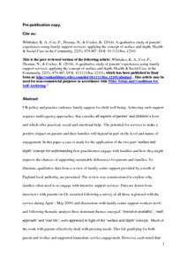 Whittaker, Karen orcid iconORCID: 0000-0002-3493-9396, Cox, Pat orcid iconORCID: 0000-0003-2565-4564, Thomas, Nigel orcid iconORCID: 0000-0002-5310-9144 and Cocker, Karen (2014) A qualitative study of parents' experiences using family support services: applying the concept of surface and depth. Health and Social Care in the Community, 22 (5). pp. 479-487. ISSN 0966-0410