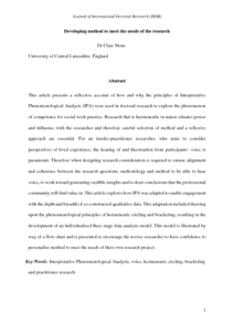 Stone, Clare orcid iconORCID: 0000-0001-7331-4244 (2015) Developing method to meet the needs of the research. Journal of International Doctoral Research, 4 (1). pp. 10-31. ISSN 2328-0832
