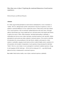 It is widely suggested that participation in rural tourism is underpinned by a sense of rural place or “rurality”. However, although nature and the countryside have long been recognised as a source of spiritual or emotional fulfilment, few have explored the extent to which tourism, itself often claimed to be a sacred experience, offers an emotional/spiritual dimension in the rural context. This paper addresses that literature gap. Using in-depth interviews with rural tourists in the English Lake District, it explores the extent to which, within respondents’ individual understanding of spirituality, a relationship exists between sense of place and deeper, emotional experiences and, especially, whether participation in rural tourism may induce spiritual or emotional responses. The research revealed that all respondents felt a strong attachment to the Lake District; similarly, and irrespective of their openness to spirituality, engaging in rural tourism activities resulted in highly emotive experiences for all respondents, the description/interpretation of such experiences being determined by individual “beliefs”. However, sense of place was not a prerequisite to emotional or spiritual experiences. Being in and engaging with the landscape � effectively becoming part of it � especially through physical activity is fundamental to emotional responses.