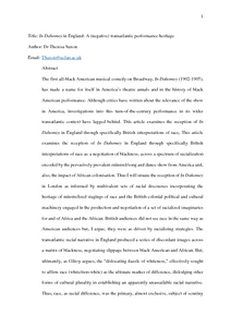 The first all-black American musical comedy on Broadway, In Dahomey (1902-1905), has made a name for itself in America’s theatre annals and in the history of black American performance. Although critics have written about the relevance of the show in America, investigations into this turn-of-the-century performance in its wider transatlantic context have lagged behind. This article examines the reception of In Dahomey in England through specifically British interpretations of race, This article examines the reception of In Dahomey in England through specifically British interpretations of race as a negotiation of blackness, across a spectrum of racialization encoded by the pervasively prevalent minstrel/song and dance show from America and, also, the impact of African colonisation. Thus I will situate the reception of In Dahomey in London as informed by multivalent sets of racial discourses incorporating the heritage of minstrelized stagings of race and the British colonial political and cultural machinery engaged in the production and negotiation of a set of racialized imaginaries for and of Africa and the African. British audiences did not see race in the same way as American audiences but, I argue, they were as driven by racializing strategies. The transatlantic racial narrative in England produced a series of discordant images across a matrix of blackness, negotiating slippage between black American and African. But, ultimately, as Gilroy argues, the “dislocating dazzle of whiteness,” effectively sought to affirm race (white/non-white) as the ultimate marker of difference, dislodging other forms of cultural plurality in establishing an apparently unassailable racial narrative. Thus, race, as racial difference, was the primary, almost exclusive, subject of scrutiny in the press reviews of In Dahomey. Despite claims made in the press of a brotherhood between black performers and white audiences in England, In Dahomey was categorized by reviewers as a form of minstrelized song and dance show entangled in a racialized hierarchy. This article argues that though In Dahomey was formulated with an uplift agenda, to challenge, subtly, racial prejudice, the show’s potential resistance to racialized stereotyping was, ultimately, eroded in England’s auditoria.