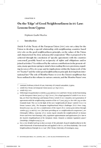 This chapter therefore proposes to deepen our understanding of the good neighbourliness principle in EU law, as enshrined in Article 8 TEU and within the overall fabric of the EU Treaties, from the perspective of the Member States – more specifically of a single one, Cyprus – in an attempt to identify some of the outer limits of good neighbourliness. This will be done through a review of the scope of Article 8 TEU, including from the perspective of a single Member State (2), followed by an analysis of the outward application of good neighbourliness in the context of Cyprus ‘from within’ the EU (3) and finally ‘from outside’ the EU, also from the lens of reciprocity and shared values arguably lying at the core of good neighbourliness (4). The lessons to be learnt from Cyprus will relate to the scope of good neighbourliness in the EU legal order and to the specific forms it may take when considering the troubled relations of a single Member State with its ‘neighbours’. Good neighbourliness may be more ‘demanding’ on a specific Member State in a situation internal to the EU, but there may be counterparts in this case. This chapter will also assess the extent to which uneasy bilateral relations between a Member State and a third country can be efficiently addressed through EU external relations, the form this good neighbourliness will take and the legal and political implications it may have on other EU Member States, the third country concerned and the values of the Union.